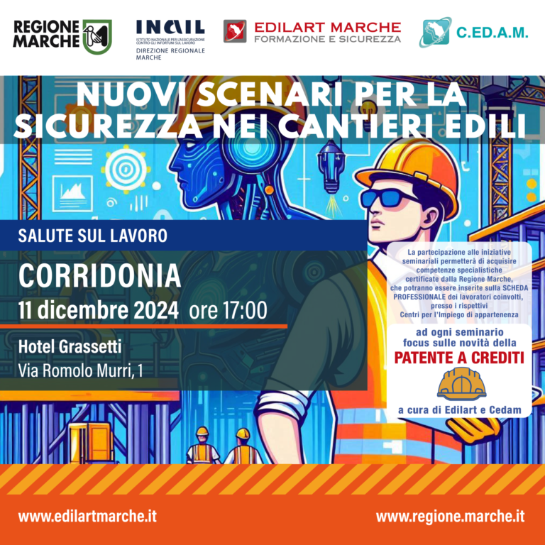 Edilart Marche, in collaborazione con CEDAM, Regione Marche ed INAIL, organizza dei seminari su tematiche che riguardano il futuro del settore dell'edilizia (Intelligenza Artificiale, Salute sul Lavoro e Aspetti Relazionali).