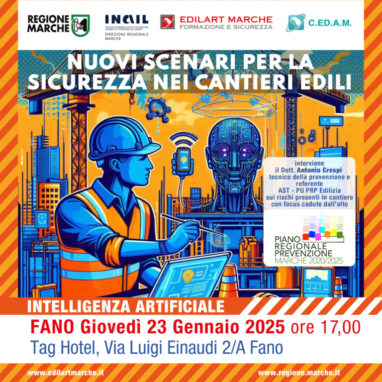 Edilart Marche, in collaborazione con CEDAM, Regione Marche ed INAIL, organizza dei seminari su tematiche che riguardano il futuro del settore dell'edilizia (Intelligenza Artificiale, Salute sul Lavoro e Aspetti Relazionali).